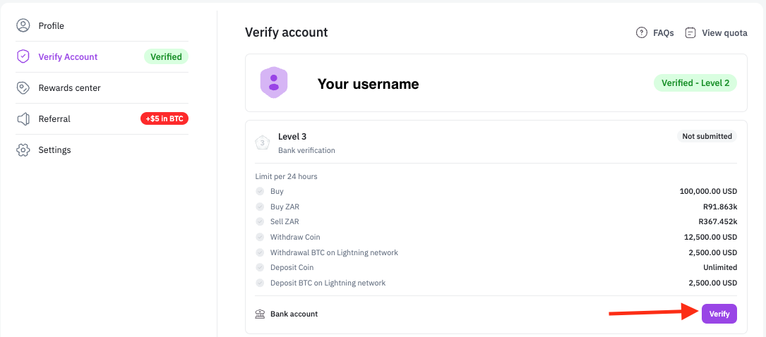 Step 2: Scroll down to Level 3: Bank verification and click to Verify