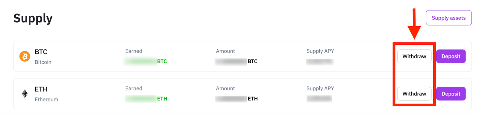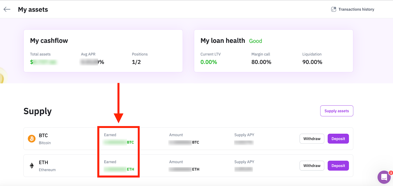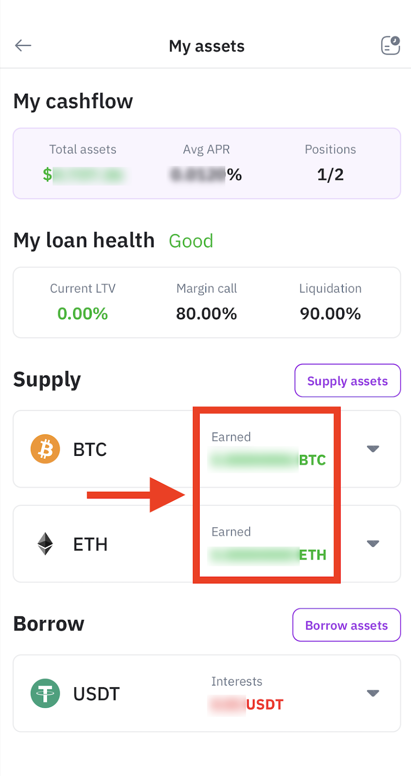Step 2: On the “My assets” page, you can see the amount of your supply, APY, and how much you have earned