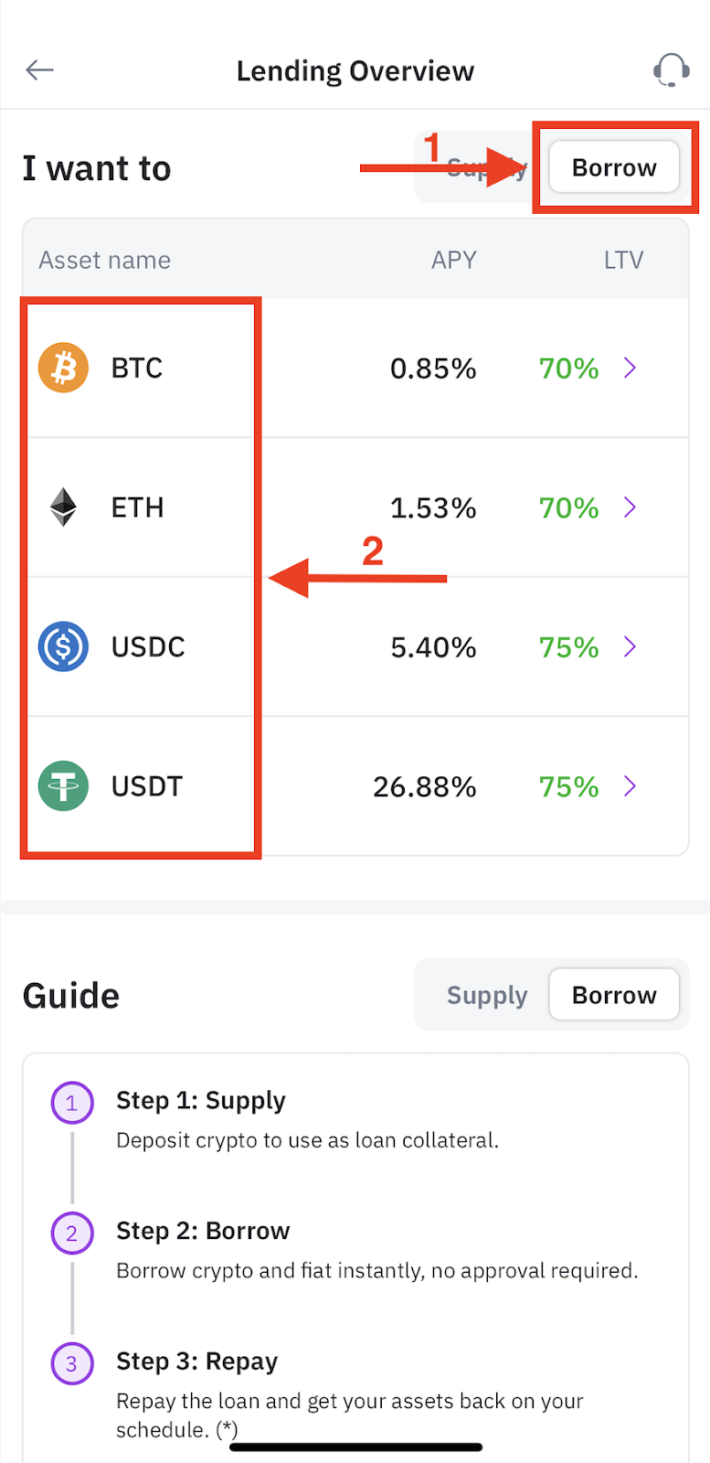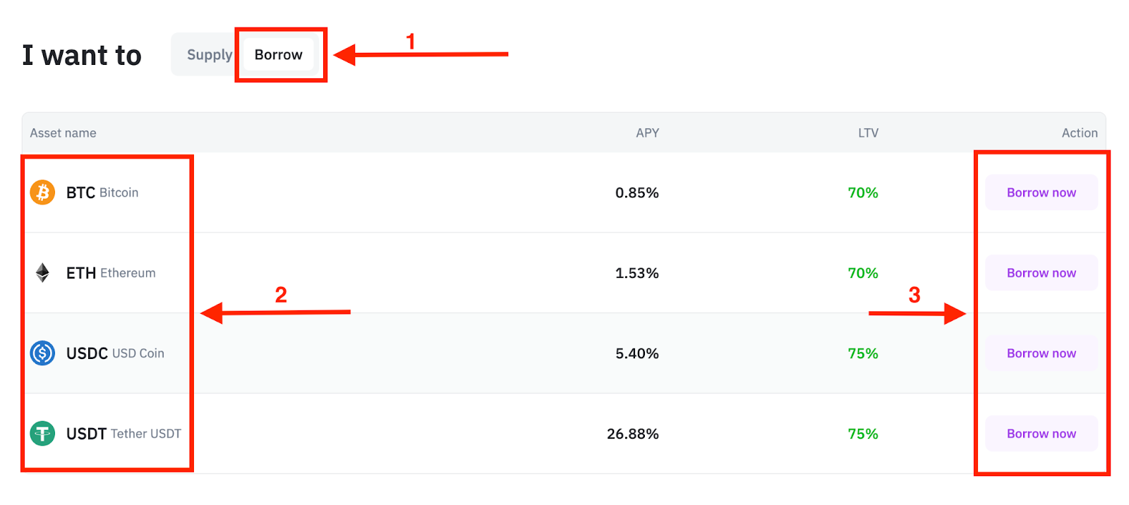 Step 1: Back to Lending page => Choose “Borrow”=> choose the coin you want to borrow and choose “Borrow now”